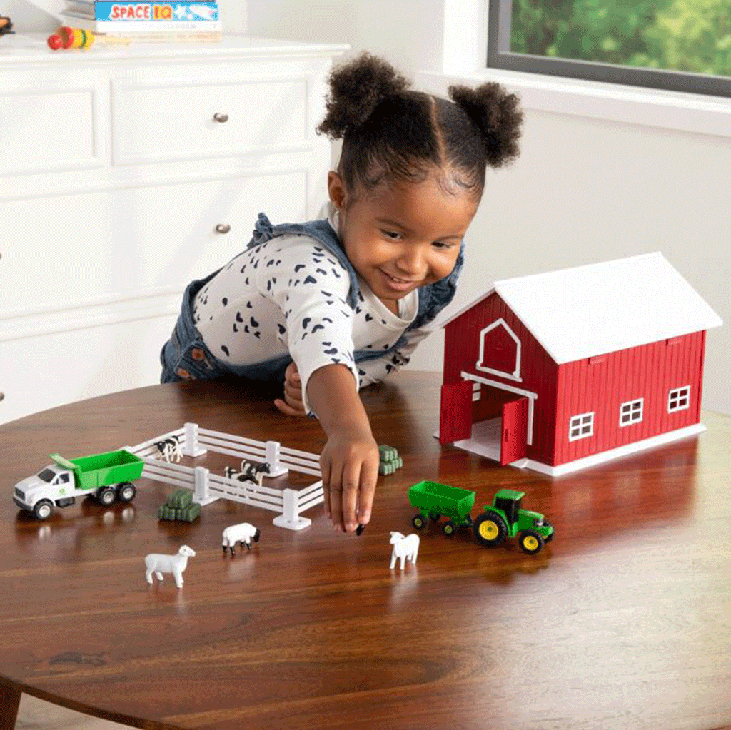This classic 24-piece farm set includes everything a young farmer needs for hours of imaginative play — a John Deere tractor, wagon, and truck, farm animals figures (4 cows, 4 sheep), 6 hay bales, 6 fence pieces, and an iconic red barn.