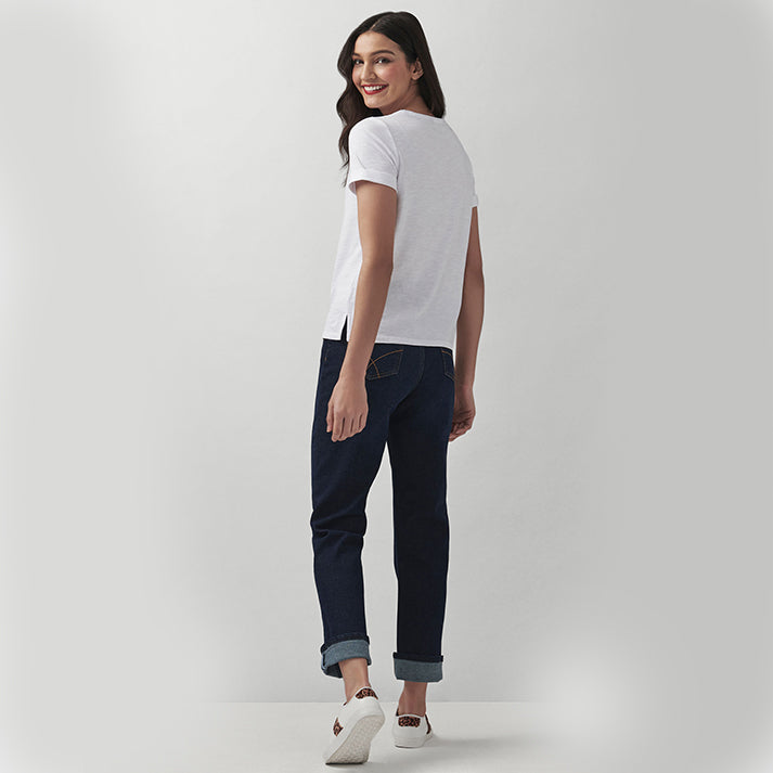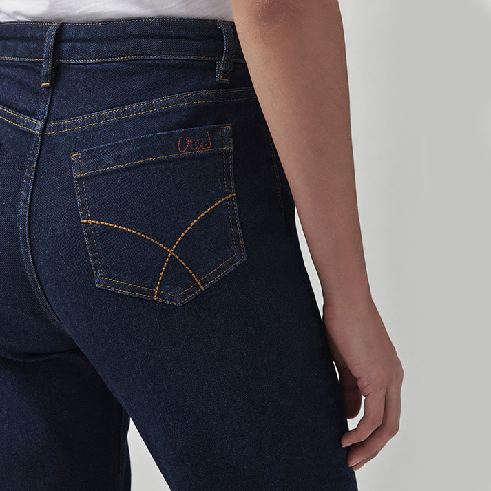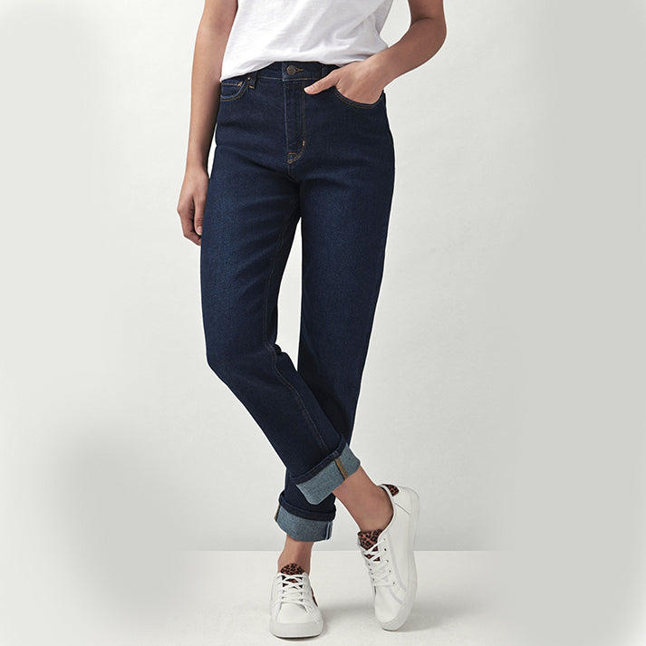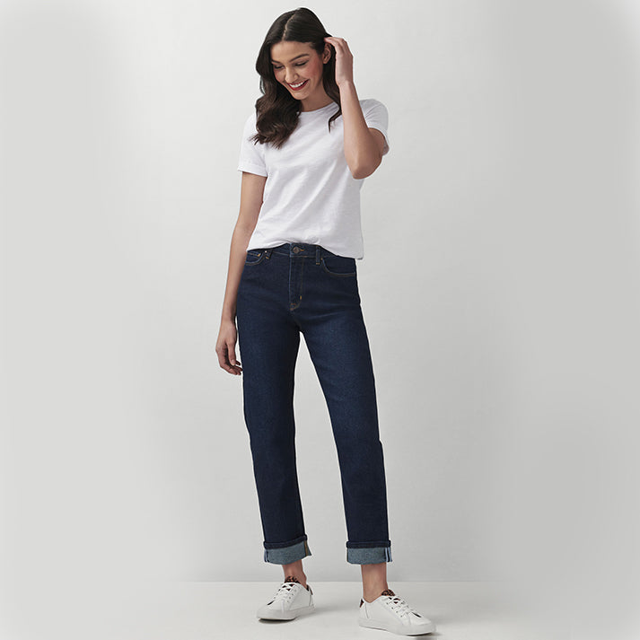 High waisted, slightly slouchy and infinitely stylish: meet our Girlfriend jean in a dark wash. Finished with classic stitching and branded rivets, this denim has been designed for an authentic feel. Layer with a Breton and loafers. An all-season staple.