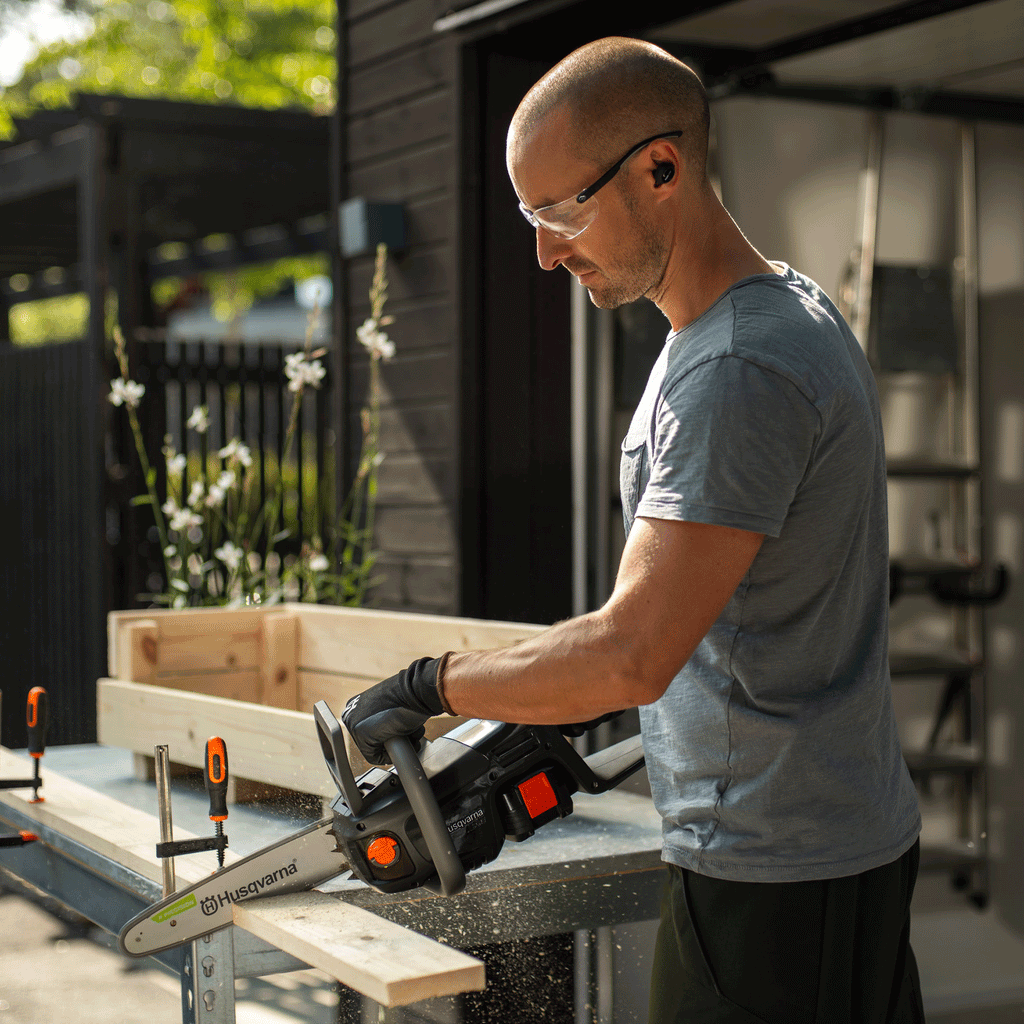 Built with safety and convenience in mind, the chainsaw features guiding orange interaction points, an active chain brake and automatic shutdown after 180 seconds of inactivity. Compatible with Husqvarna’s Aspire™ storage system, it includes a dedicated hook for tidy wall storage.