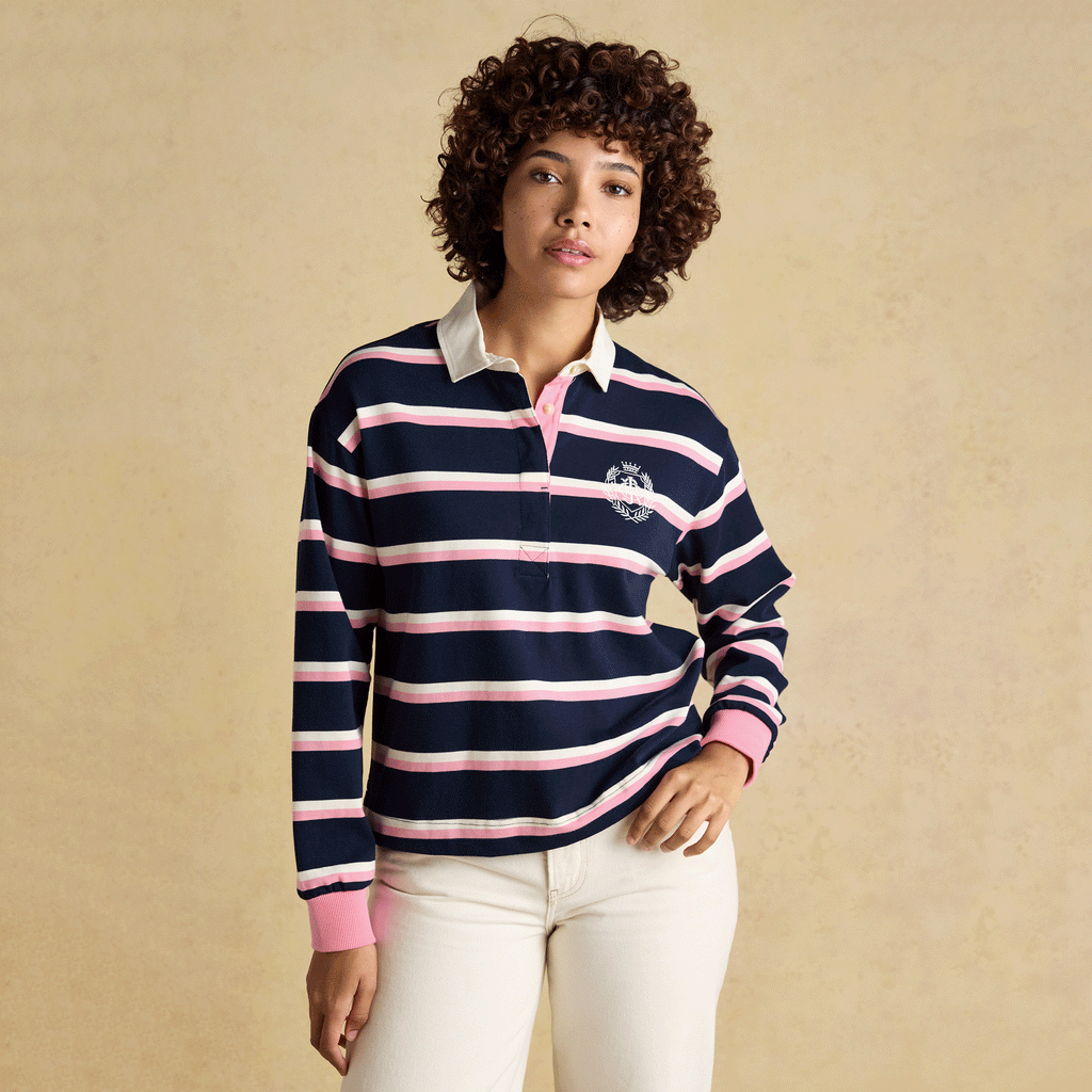 Joules Lara Striped Boxy Fit Rugby Shirt in Navy & Pink