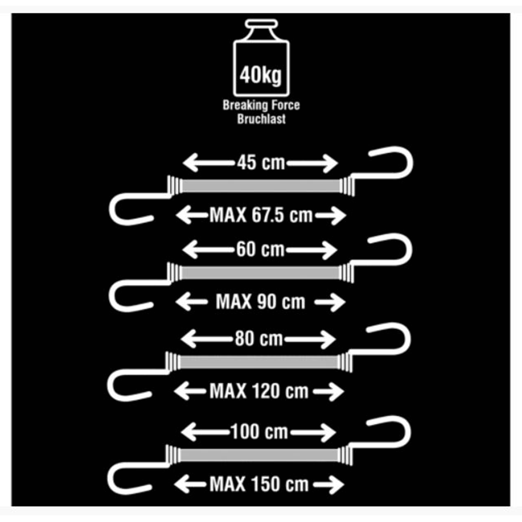 Colour-coded size markers make it simple to identify the correct length at a glance, while the included storage frame with built-in carry handle keeps all ten cords neatly organised and ready for transport.