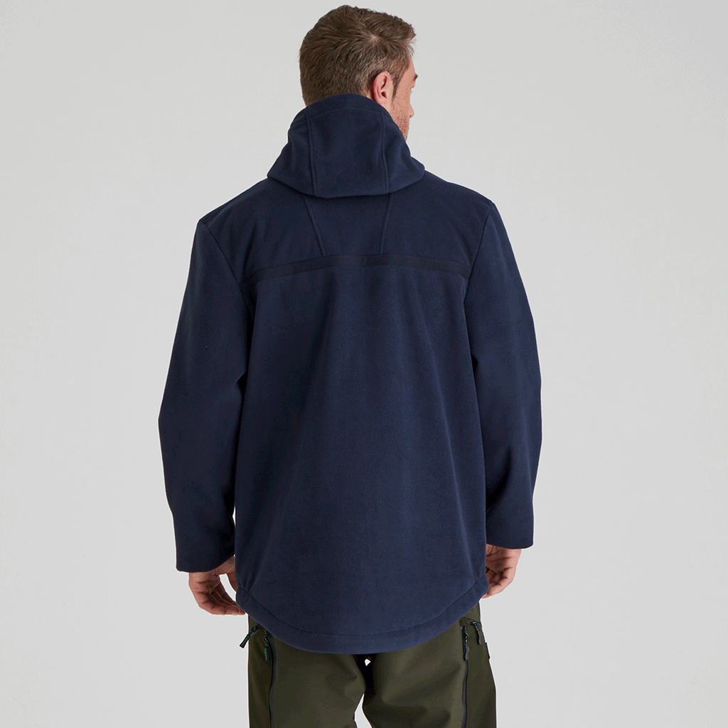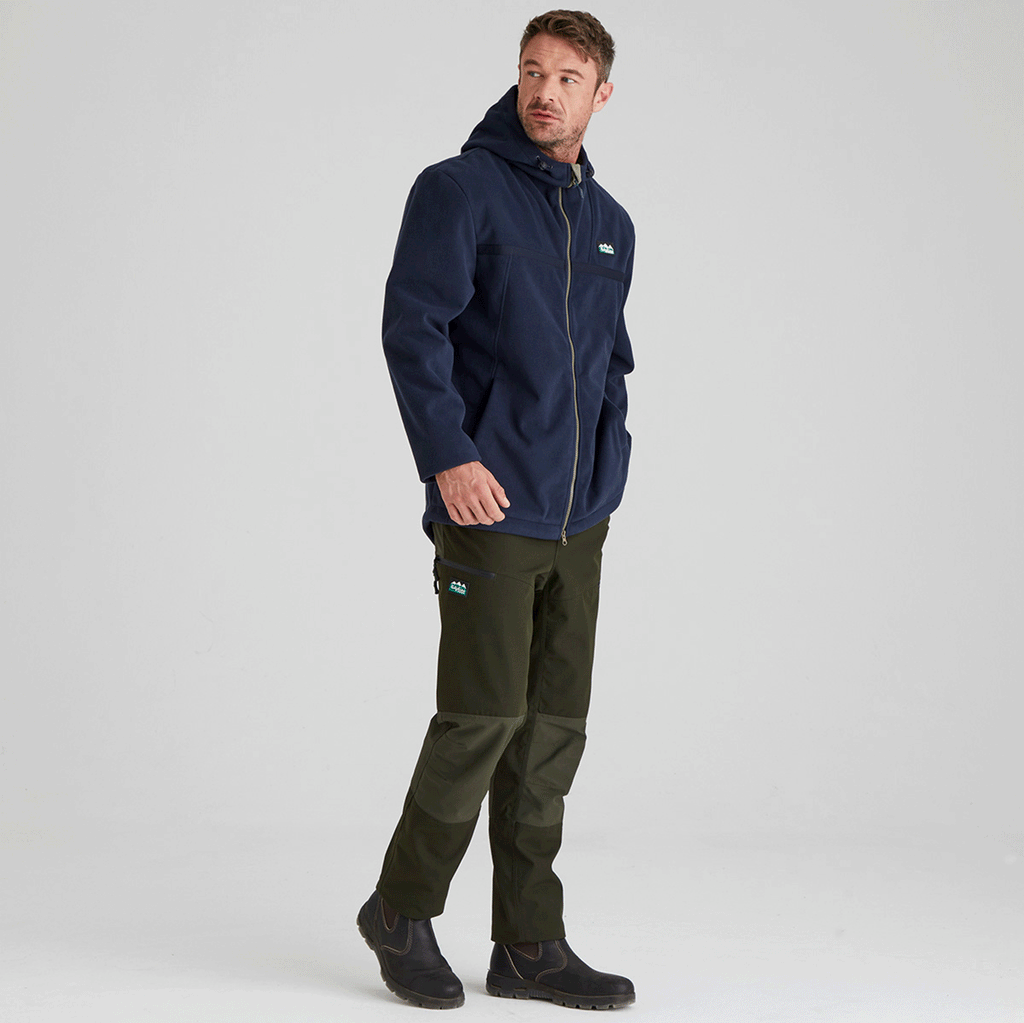 A deep adjustable fleece hood provides full coverage in strong winds, while twin zipped hand pockets keep essentials close and hands warm.