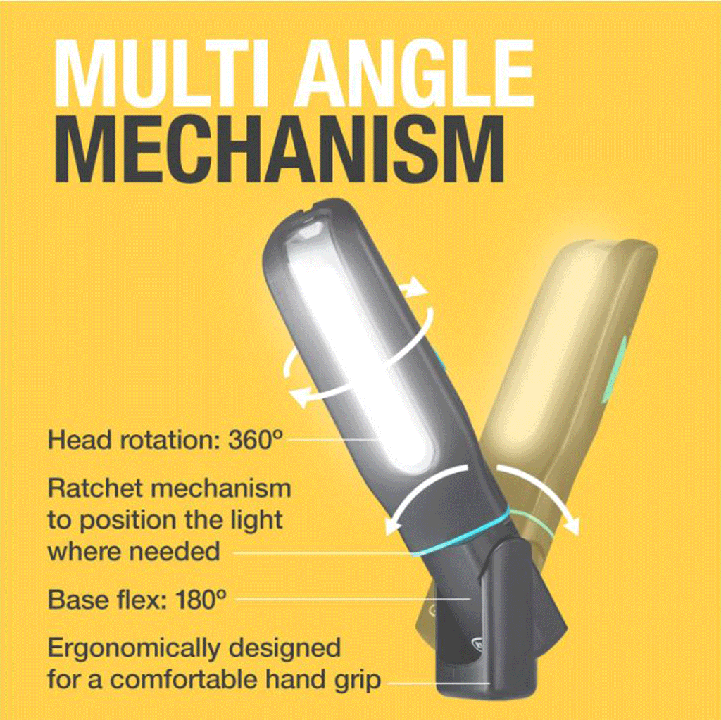 The 360° twist and 180° flex base allow precise light positioning, while strong magnets and a rotating hanging hook make hands-free working easy.