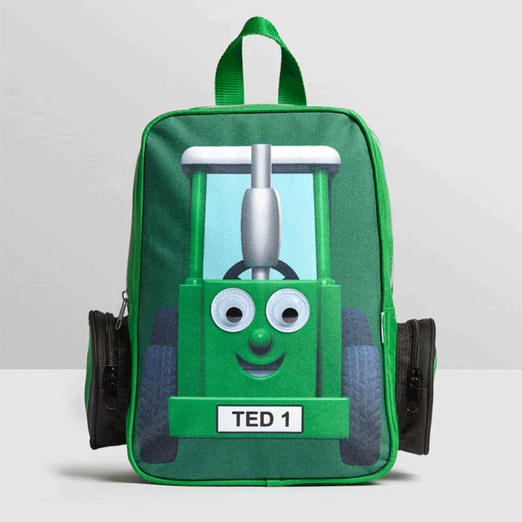 With plenty of room to carry all their daily essentials, this fun and functional bag features Tractor Ted’s friendly face, googly eyes, and wheel-shaped zip pockets for extra storage.